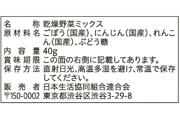 ●原材料名:ごぼう(国産)、にんじん(国産)、れんこん(国産)、ぶどう糖 ※原材料名の情報は変更になる場合があります。ご利用の際は、商品パッケージでご確認ください。