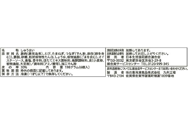 原材料名:豚肉(鹿児島県)、えび、たまねぎ、つなぎ(でん粉、卵白(卵を含む))、豚脂、砂糖、粒状植物性たん白、しょうゆ、植物油脂(ごまを含む)、オイスターソース、食塩、香辛料、ほたてエキス調味料、発酵調味料、皮(小麦粉、植物油脂、大豆粉)/調味料(アミノ酸等)、加工でん粉 |