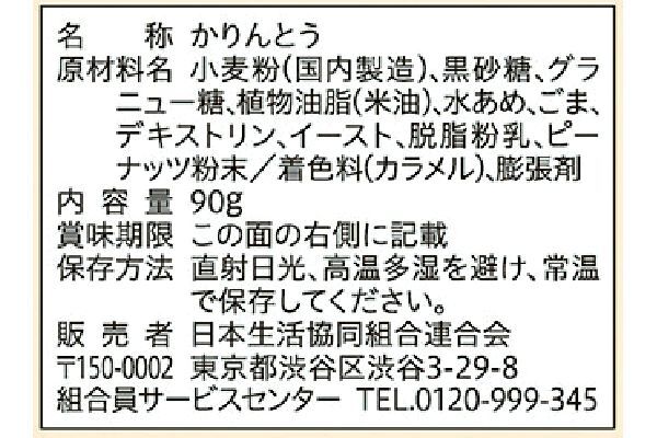 原材料名:小麦粉(国内製造)、黒砂糖、グラニュー糖、植物油脂(米油)、水あめ、ごま、デキストリン、イースト、脱脂粉乳、ピーナッツ粉末/着色料(カラメル)、膨張剤 |